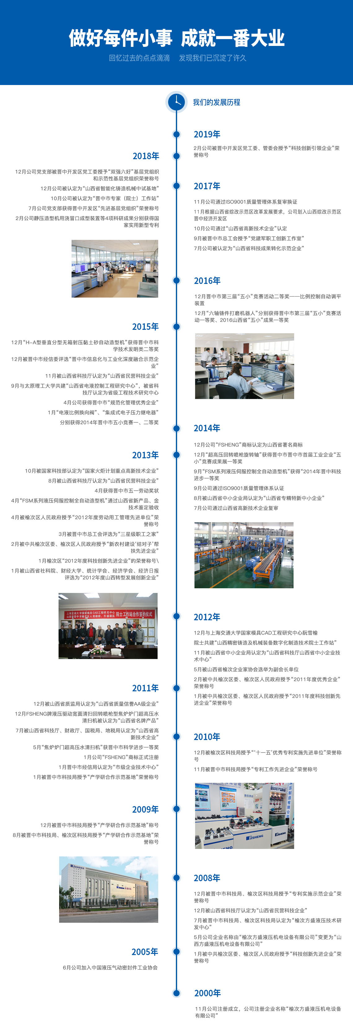 山西方盛液压机电设备有限公司地处山西省综改示范区晋中经济开发区,于 2000年11月注册成立,是集液压产品开发、制造、贸易为一体的科技部火炬重点高新技术企业、省级高新技术企业。公司现有员工260余名,科研人员52名,拥有专业的精密数控加工设备和检验检测设备60余台,先后获得2项国家发明专利、41项国家实用新型专利,具备专业的液压传动产品制造能力和质量保证能力。